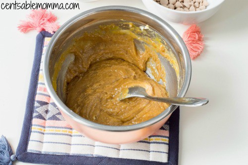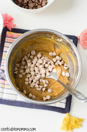 - Fold in caramel chips and pour batter into coated pan.