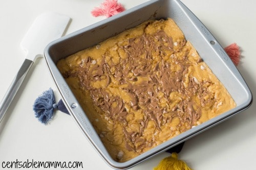 Once time is up, remove from oven and use a toothpick to swirl milk chocolate. Place back in the oven and bake for 22-25 minutes.